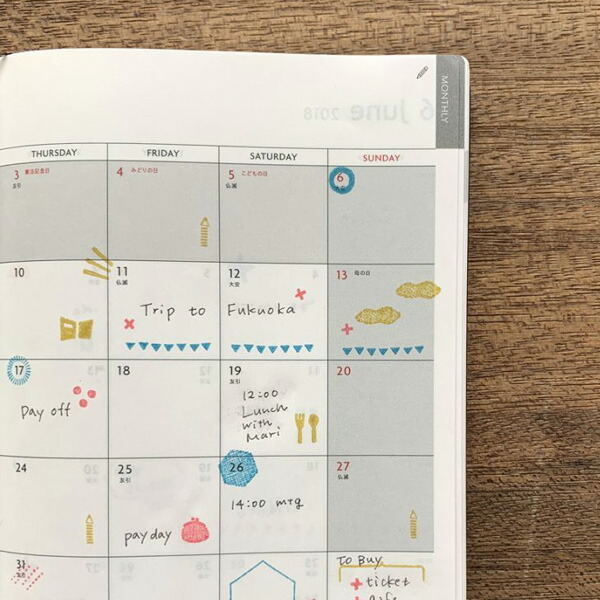 バレットジャーナルを続けるには、上手に手抜きをするのもコツ。このマスキングテープを使えば、小さな文字でたくさん数字を書く必要もなく、好きなところにサッと暦が作れちゃいます。曜日は英語と日本語から選べるので、お好みでゲットしてくださいね。