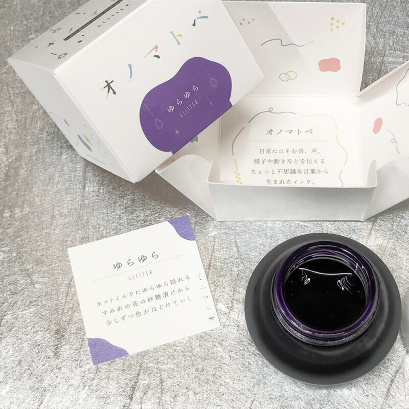 「ゆらゆら」のシックな色は、ホットミルクに溶けるすみれの花の砂糖漬けをイメージしたそう。いわれてみれば、紫色のインクにちらばるシルバーのラメが、砂糖のように見えてきませんか?