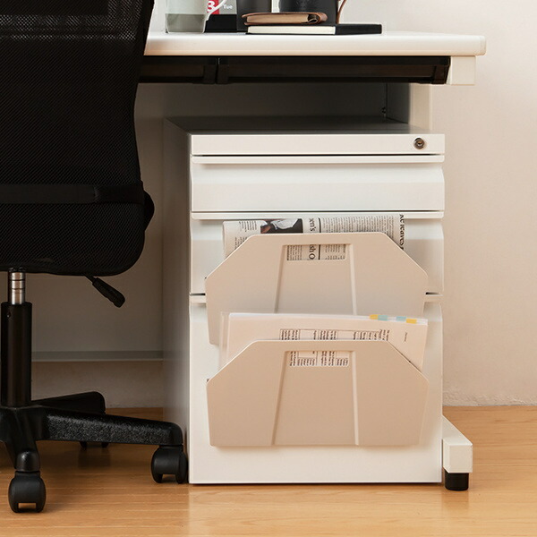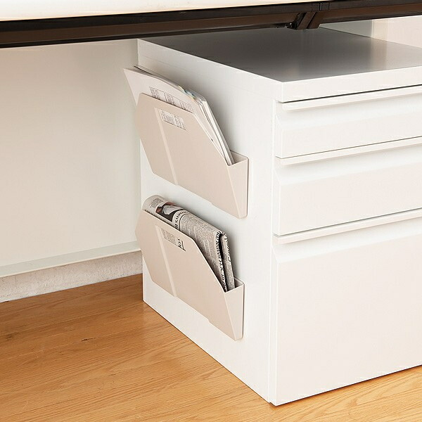 こんな風にデスクの足元に貼って使っても、ポケットにほど良い角度がついているからプリントの整理がしやすいんです。キッチンやリビングに、プリントの一時的な保管場所にしても◎。