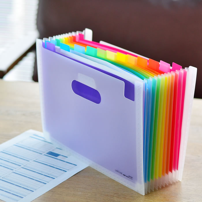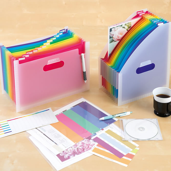 最後は、カラフルなファイルスタンド「ドキュメントスタンド アドワン レインボー 」です。かさ張りがちなプリントの整理にぴったりのこちらのファイルスタンド、まるでアコーディオンのように、プリントの量に合わせて広がったり縮んだりできますよ。