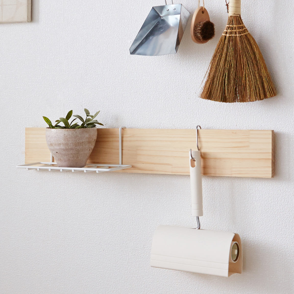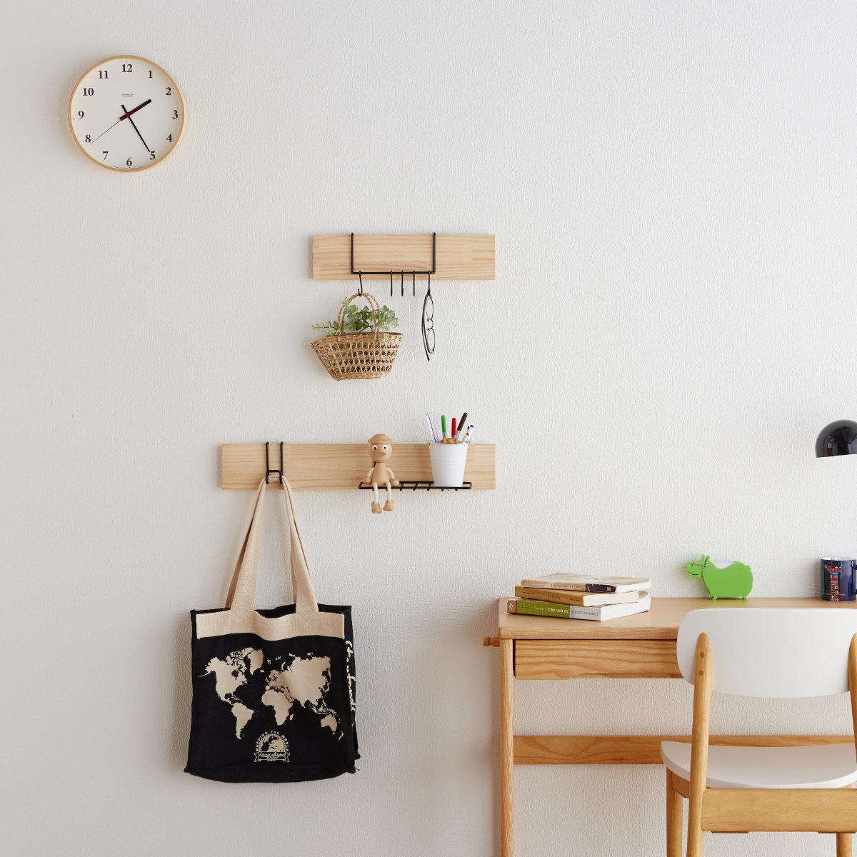 こちらは、「LABRICO」の「ナゲシレール」。木材を壁に固定して好みにアレンジができるウォールストレージです。カット済みの木材とナゲシレールブラケットがセットになった長押(なげし)風のレールキットで、簡単にDIYできますよ。フックなどのオプションパーツも揃っているため、自分だけのウォールストレージが作れます。