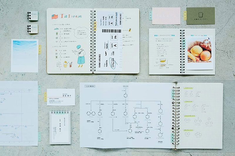 こちらは、「カンミ堂」の「リングリーフ」。3つ穴が空いた付箋で、リングノートのワイヤー部分に貼り付けて写真や書類、カードなどをノートにつなげることができるんです。