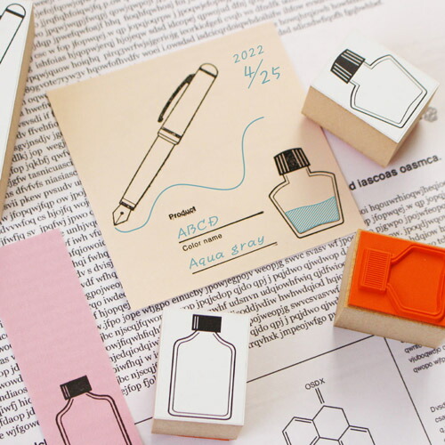 インクボトルのラバースタンプセットは、万年筆インクの見本帳作りにピッタリのアイテム。スタンプを押すだけで、簡単に統一感のあるインクの見本帳が作れます。形の異なるインクボトルのスタンプが5つと、万年筆がデザインされたスタンプ、インク情報が記入できるスタンプの計7つのセットです。デザインパターンが充実しているので、誰でも簡単におしゃれなインク見本帳が作れますよ。