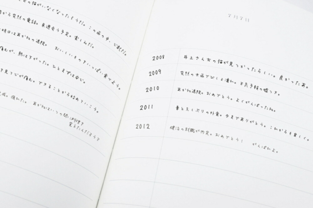 ずっしりと重みのある日記帳に10年間を記録し終わると、日記帳は自分史に早変わり。記録しておかなければ忘れてしまっていたようなささいな日常から、人生にとっての大きな出来事まで、しっかり手元に残しておけますよ。