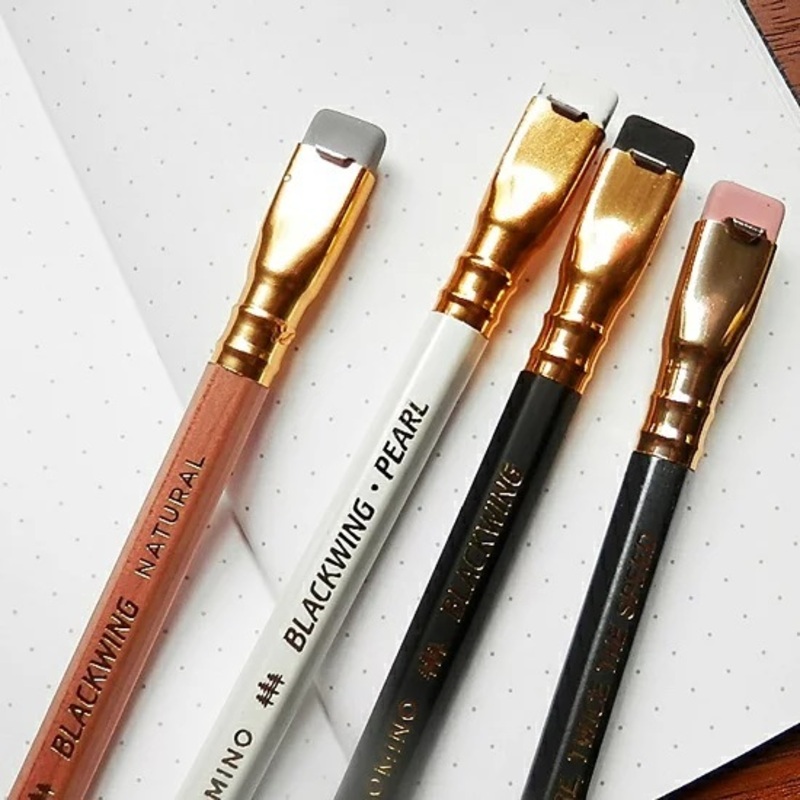 パロミノの「ブラックウィング」は、鉛筆好きに愛されている1本。レギュラーモデルは全部で4種類。黒い軸の鉛筆が4B、ホワイトの軸が2B、グレーがB、木目調がHBと、鉛筆の硬さ(濃度)ごとに分けられています。