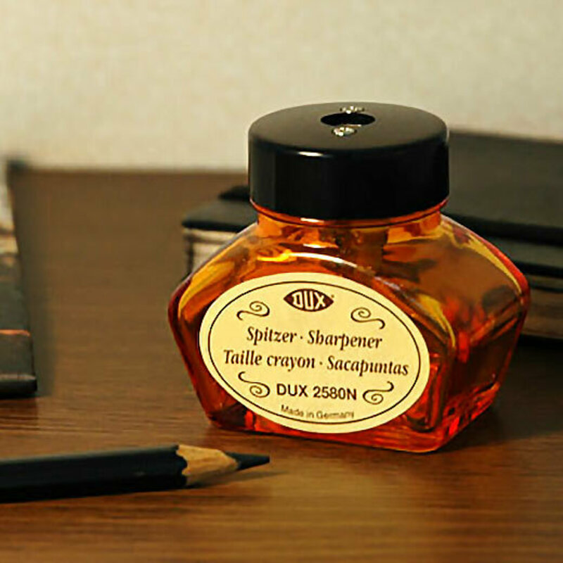 鉛筆削り専門のメーカー「DUX(ダックス)」が手掛ける、インクボトル風シャープナー。万年筆のインクのような存在感のあるデザインは、デスクの上でもひと際目を惹きます。