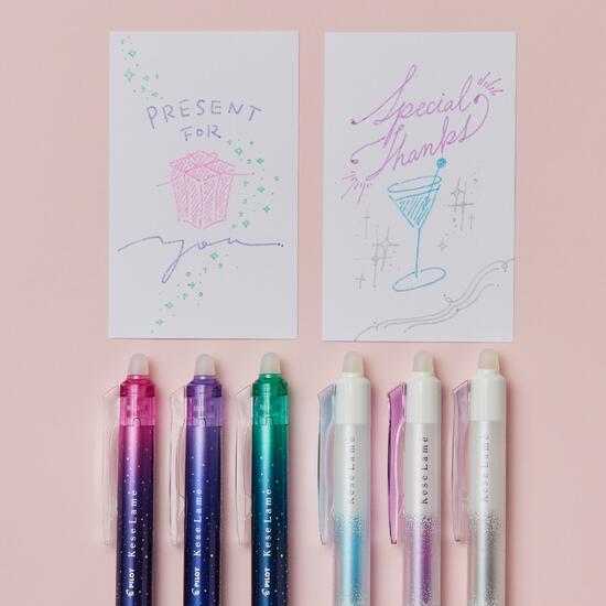 最後にご紹介するのは「PILOT(パイロット)」の「KeseLame(ケセラメ) 12color set 0.7mm」。フリクションタイプ×ラメ入りインクのちょっと珍しいカラーボールペンです。