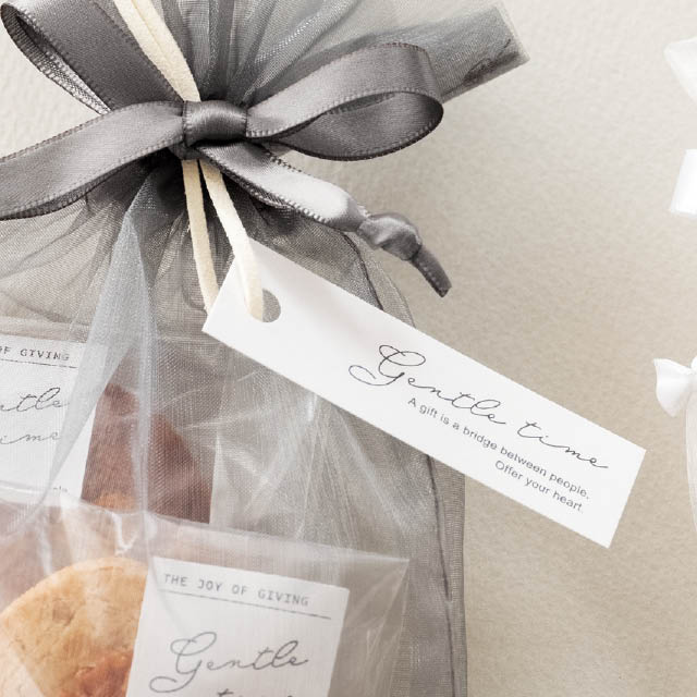 シンプルなラッピングがお好みの方には、こちらのタグがおすすめ。おしゃれな英字が綴られたモノトーンのタグは、男女問わず使いやすいのが魅力です。どんな色の包装紙にもマッチするので、ラッピングのマストアイテムになりますよ。