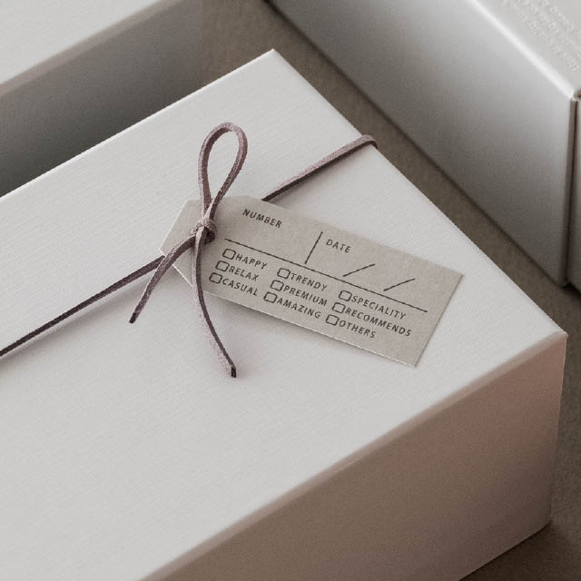 グレーのタグには、プレゼントのおすすめポイントを伝えるチェックボックスが付いています。「HAPPY」や「RELAX」などの項目があり、プレゼントによってこんな気分を味わえるよ!と予告できるんです。ユニークなタグで、開ける前のワクワク感を高めてみて。