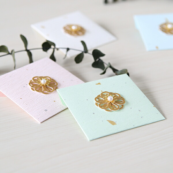 お祝いのひとときに華を添えるポチ袋がこちら。優しいパステルカラーの封筒に、繊細なデザインのお花が飾られています。封筒には所々ゴールドが入っており、お花の色と相まって高級感がぐっと上がりますね。