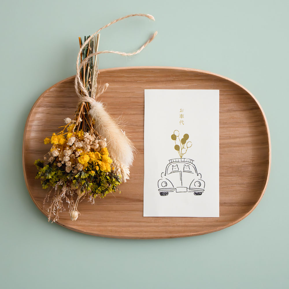 「お車代」と書かれたポチ袋は、動物がドライブしているキュートなデザイン。箔押しされた文字と風船がきらりと輝き、特別感を醸し出しています。「遠くから来てくれてありがとう」の言葉と共に渡せば、受け取る人が笑顔になること間違いなしです。
