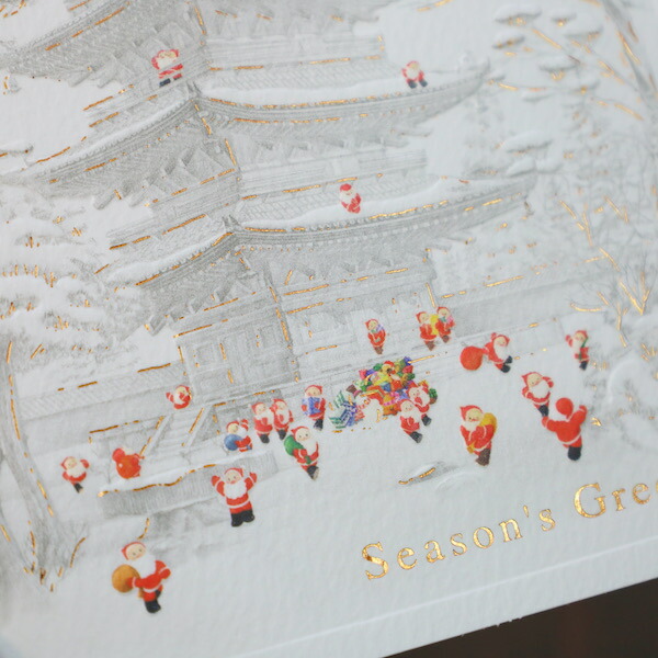こちらは「グリーティングライフ」の「ミニサンタのグリーティングカード五重塔」。雪の積もった京都の五重塔を、楽しそうに旅する小さなサンタクロースたちがとってもキュートですよね。