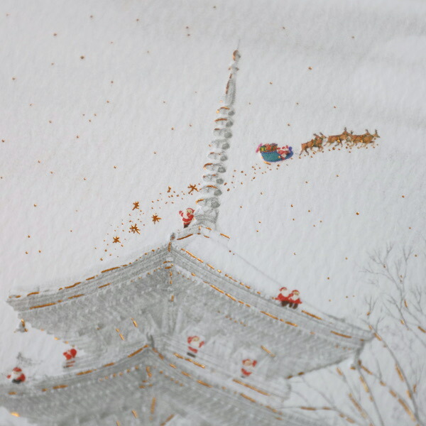 五重塔の上には、プレゼントを乗せたソリを引いているトナカイの姿も。小さなサンタクロースが手分けをして子どもたちへプレゼントを届けに旅をする、とっても心温まるクリスマスカードです。