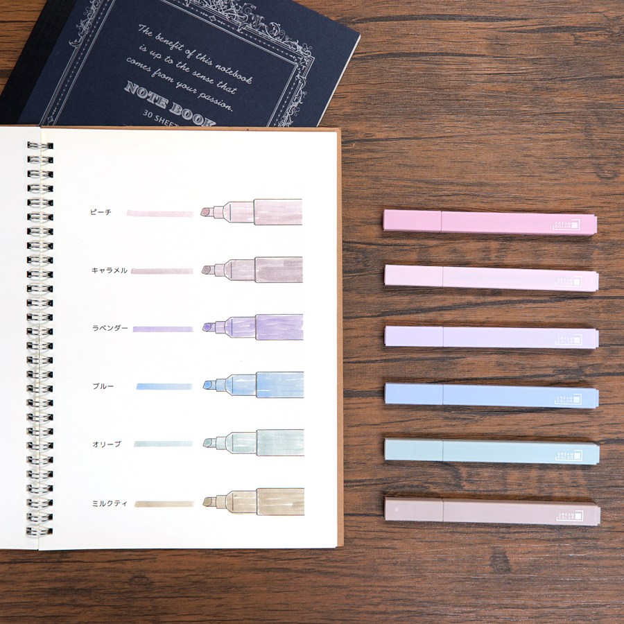 最後にご紹介するのは、コンテ風のマイルドマーカー。くすみカラーのインクにキュンとする四角い形のマーカーです。まるで画材のコンテを彷彿とさせる四角いボディは、積み木のようにデスクの上に飾りたくなりますよね。
