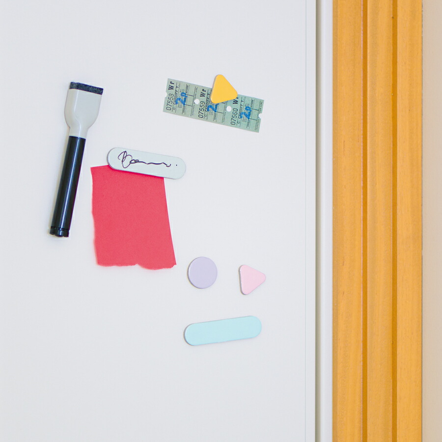 マグネットの表面にホワイトボード加工がされていてホワイトボード用のマーカーでメモが書き込める仕組みになっています。カラーはリバーシブルのため、裏表どちらも使用することができますよ。