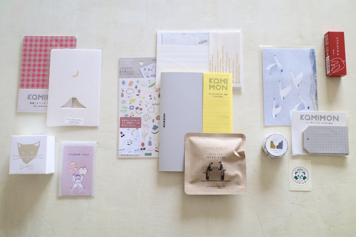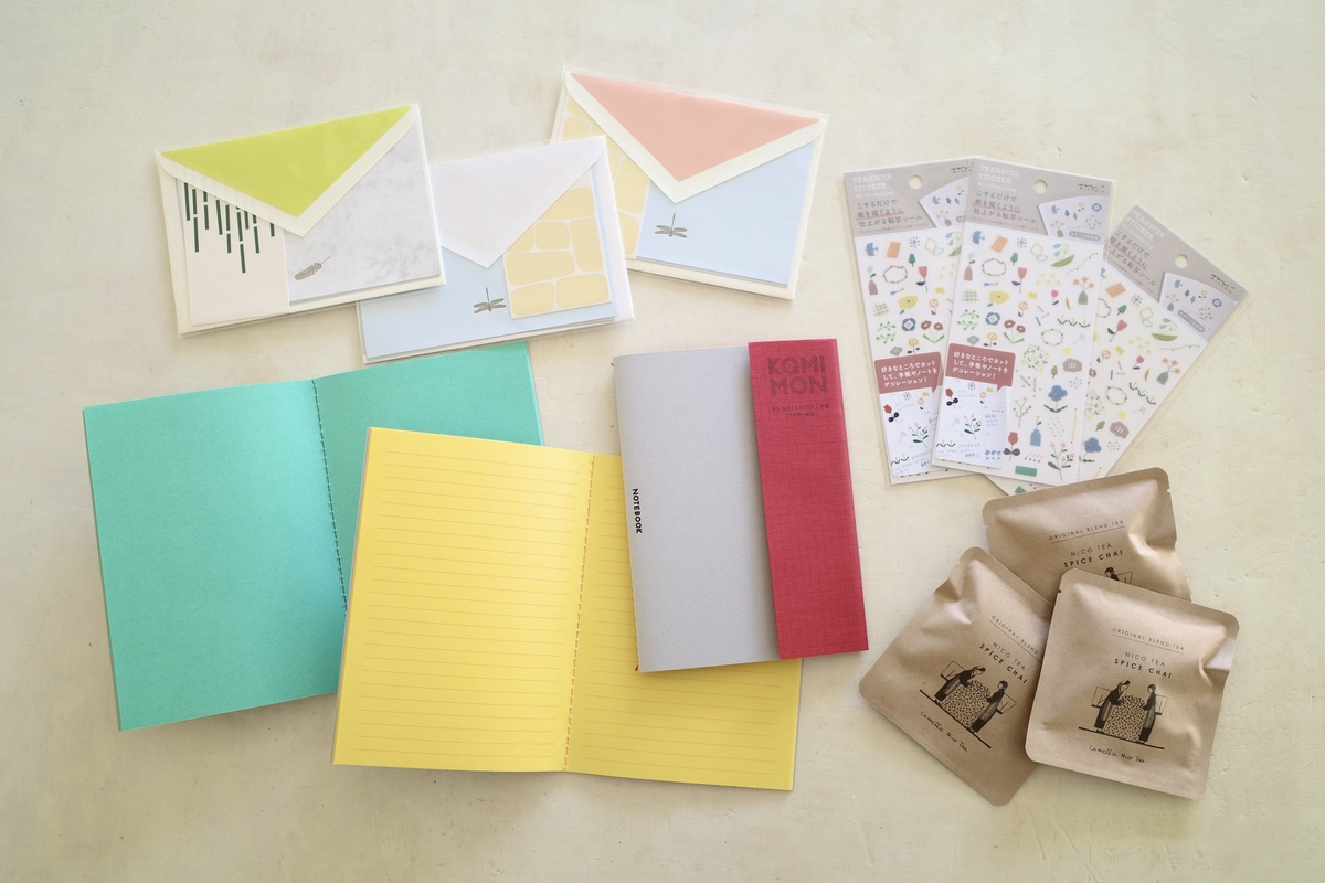 左上から時計回りに、DRESSENSE:DEADSTOCKアソートセット/ミドリ:シール 転写 モチーフ北欧柄/手紙舎雑貨店:Camellia Nico Tea スパイスチャイ/レトロ印刷JAM:KAMIMON NOTEBOOK