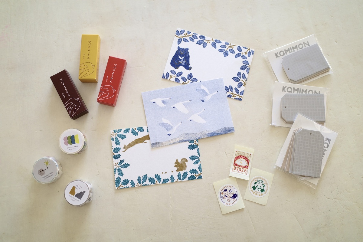 左上から時計回りに、手紙舎雑貨店:ツバメようかん/なか いつこ:ポストカード/レトロ印刷JAM:ミシン目入りタグ/オビワン レトロ郵便:ステッカー/水縞:マスキングテープ