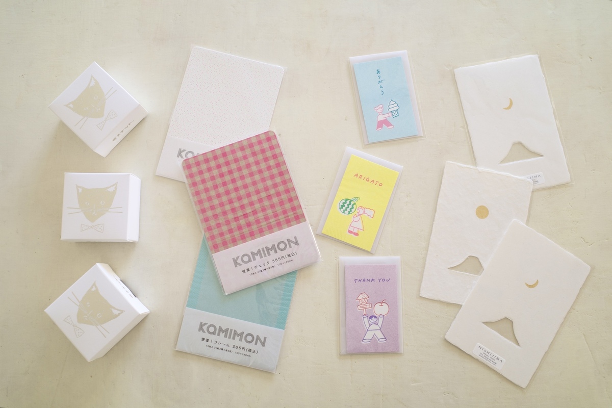 左から右に向かって、手紙舎雑貨店:ボスケットクッキーブラウン/レトロ印刷JAM:KAMIMON 便箋(15枚入り)/ニシワキタダシ×水縞:メッセージカード ひととたべもの/WACCA JAPAN:富士山ポストカードSUN &MOON