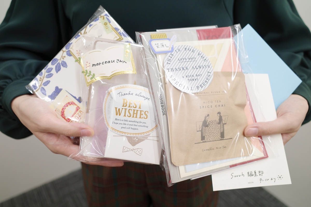 今年は文具とあわせてお茶やお菓子を贈ることに。温かいものと甘いもので一息入れて、リラックスタイムを楽しんでもらえたら嬉しいです。