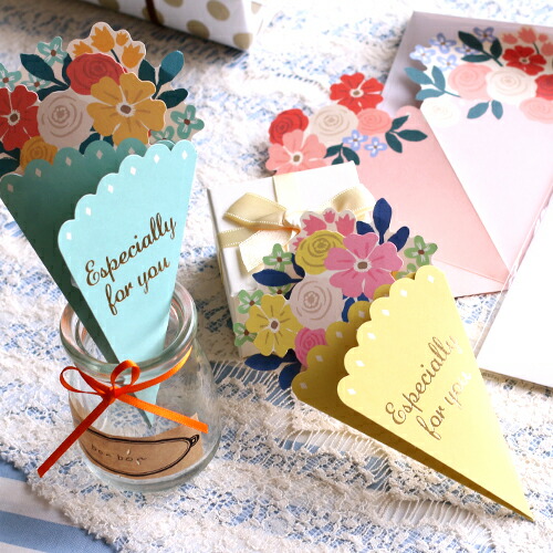 2つ目にご紹介するのは、お祝い事にふさわしいデザインの「ブーケカード」。優しい色味の上品なカードは、親や祖父母が見ても好印象を抱くはずです。「中にどんなメッセージが書いてあるんだろう」と、親子でワクワクしながら開いてもらえますよ。