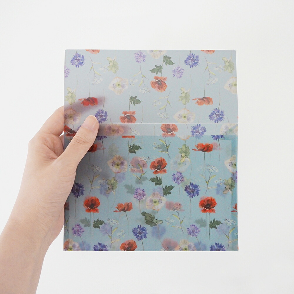 封筒は同じく透け感を楽しめるトレーシングペーパーで作られています。便箋に描かれた花がうっすらと透けて見えて、とっても素敵。薄めのインクを使用すれば、メッセージ部分が封筒越しに見える心配はないので安心してくださいね。