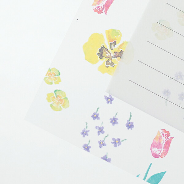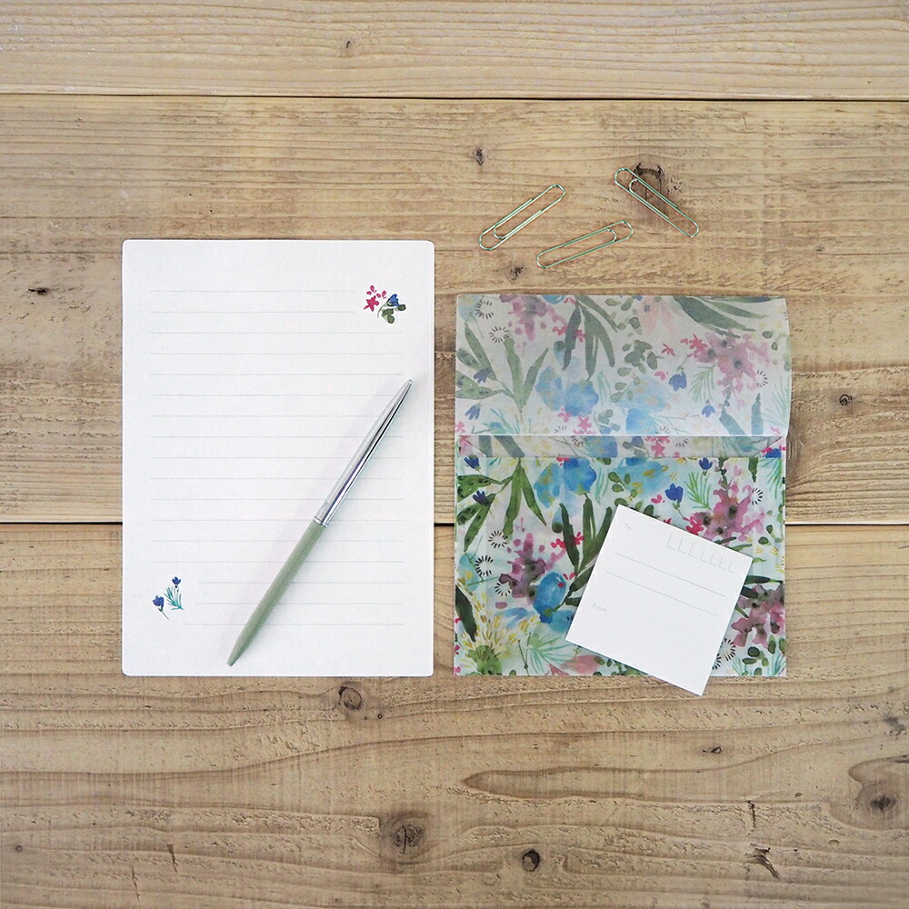 これまでは便箋が華やかなものをご紹介してきましたが、こちらは便箋ではなく封筒にたくさんの花々がデザインされています。