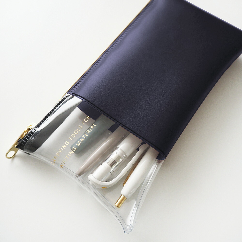 社会人の心を掴むおしゃれな文具が人気の「マトカ」から、スタイリッシュなペンケースが展開されています。レザーのような質感の生地と、透明素材を組み合わせたデザインが特徴的。中のペンがひょっこり顔を覗かせている姿にキュンとしますね。