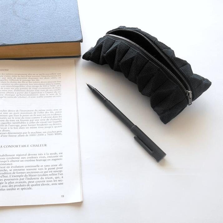 温かみのある質感で、思わず触りたくなる「oriami」ペンケース。ポリエステル糸を折り紙のように折って編み込むことで、ユニークな形が生まれました。生地に伸縮性があり、折り線に沿って形を変えられるのが特徴です。
