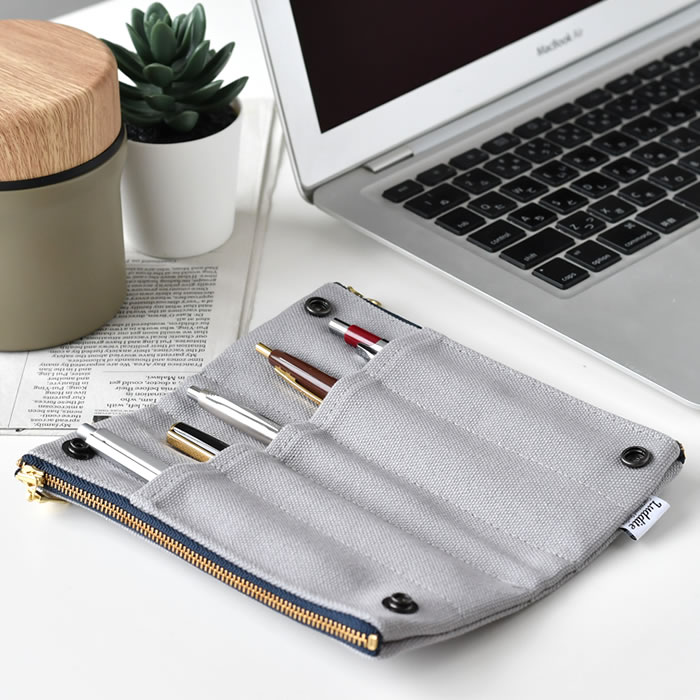 2つ折りのペンケースを広げると、最大5本のペンが並ぶペントレーに早変わり。国産の丈夫な帆布が、大切なペンをしっかり守ってくれますよ。机の上に置いて「今日はどのペンを使おうかな」と選ぶ時間も楽しめそう。