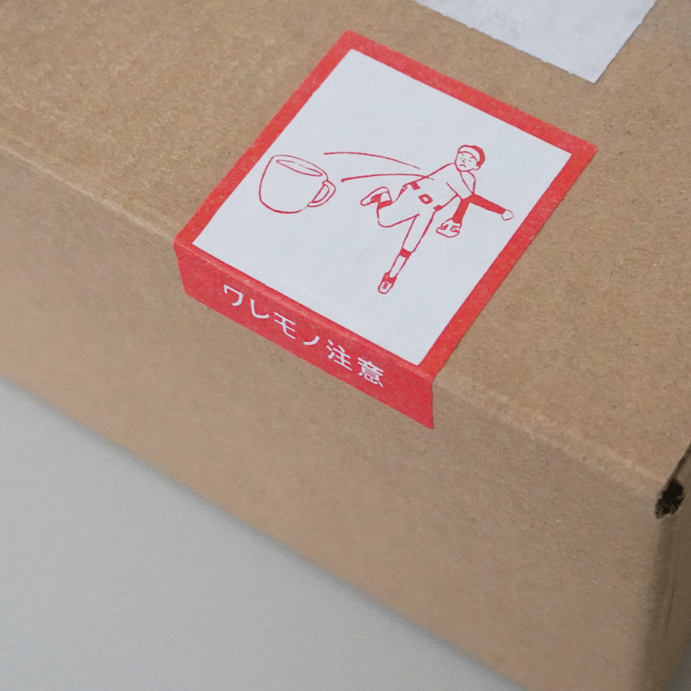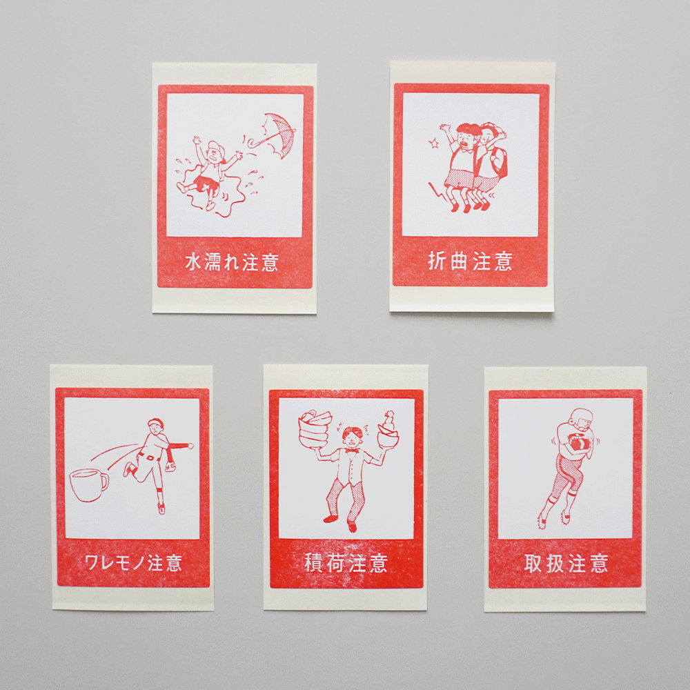 「ワレモノ注意」と描かれたこちらのシールは、野球少年がマグカップを投げているイラストで表現されています。「折曲注意」は、小学生たちが膝カックンしていたりと…どれも面白く表現されていて、もし受け取った荷物に貼ってあったらまじまじと見入ってしまいそう。