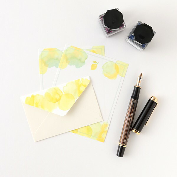 レターセットには、黄色と緑のインクの「にじみ」や「ゆらぎ」が表現されていて、美しいグラデーションに目が奪われます。中央に描かれている優しいレモンの絵柄も、鮮やかに瑞々しくて、ふんわりとレモンの香りが匂い立つよう。初夏のひととき、大切な方へのメッセージもリラックスして書けそうですね。