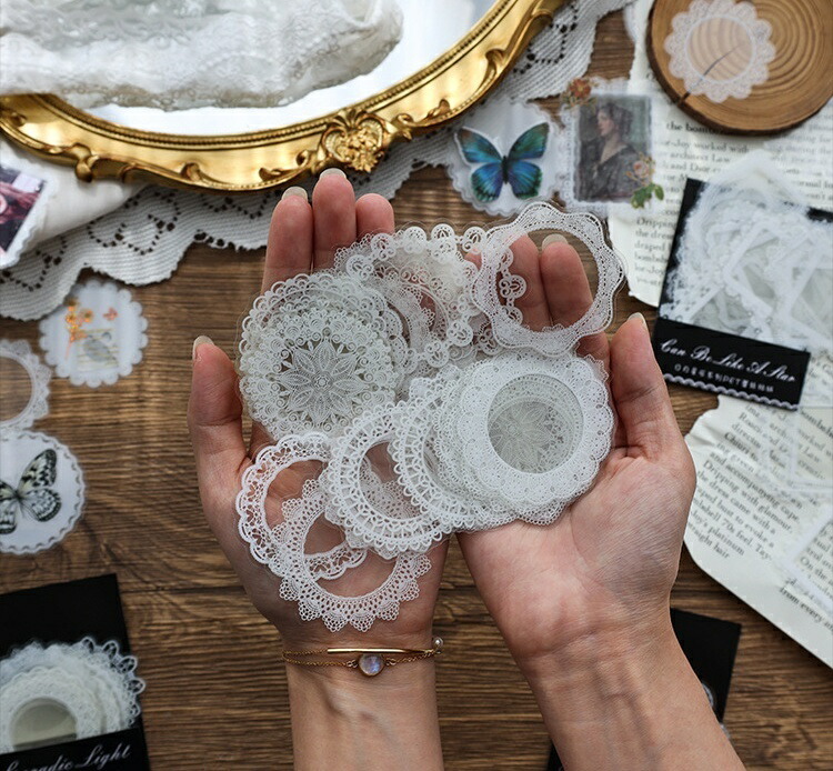 こちらは、レース柄を透明のフレークシールにしたアイテム。丸く印刷されたレース柄は、白い雪の結晶のようですね。繊細で儚げな印象があり、思わずうっとりと眺めてしまいます。