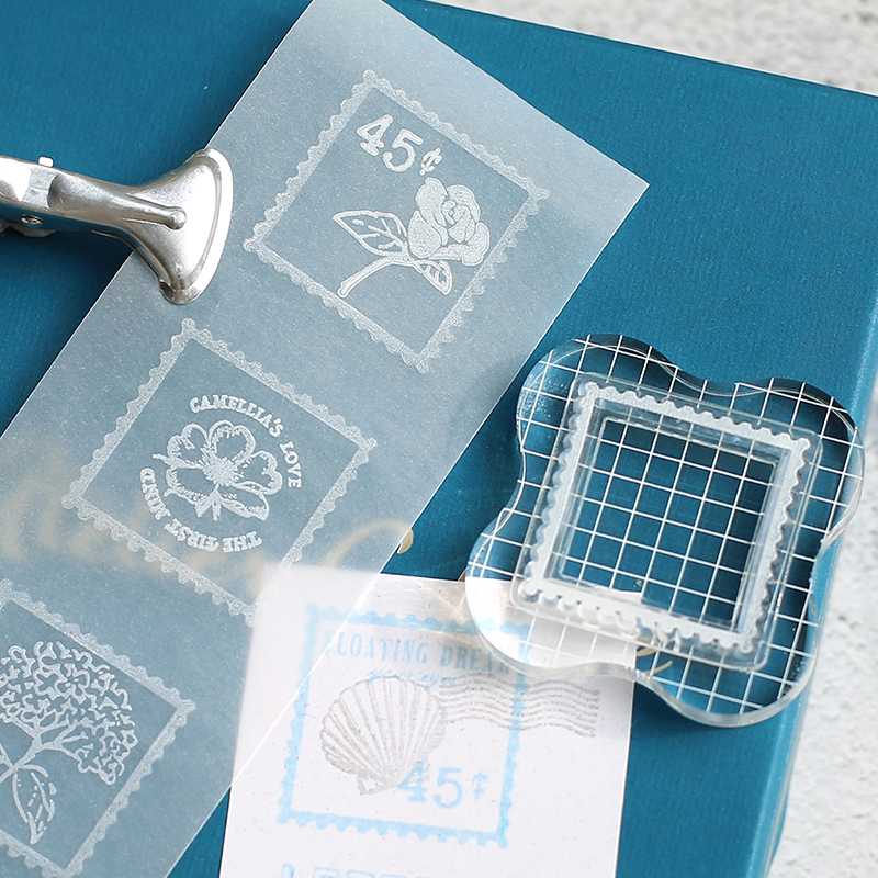 透明素材なため、押したい場所にしっかり押せるところが嬉しいポイント。シートからクリアスタンプをはがしたら、画像右にある専用のアクリルブロックに貼り付けます。あとは普通のスタンプと同じように、インクをつけてページの上へ。アクリルブロックは、何種類ものスタンプを簡単に使いこなす優秀な助手になってくれるんです。