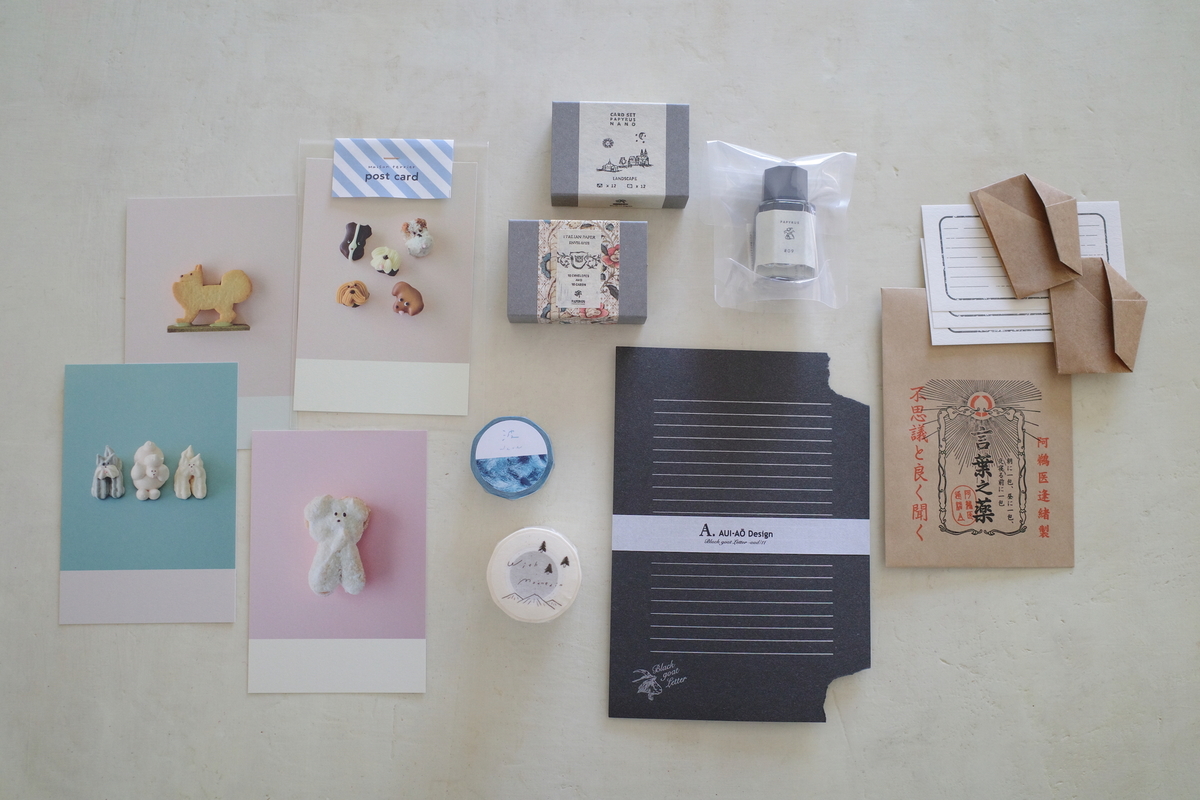 左から時計回りに、Maison terrier:post card/PAPYRUS文具店:小さな封筒とカード「イタリア紙」「太陽と月の下」、古典インク#09/AUI-AŌ Design:言葉之薬、黒ヤギレター/森酪梨 avocadomori:マスキングテープ「With mountain」「Wave」