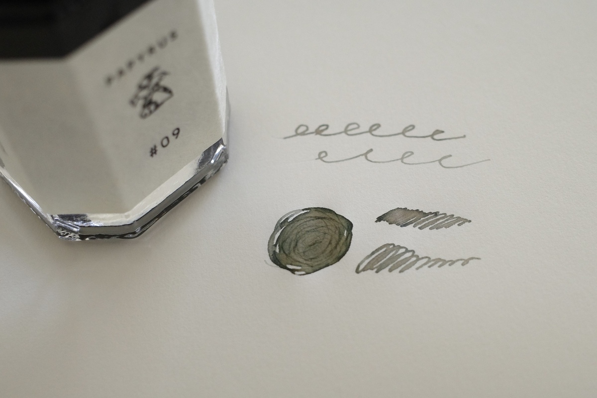 真鍮のつけペン軸とペン先を試しに向かったPAPYRUS文具店のブースでは、時間の経過とともに錆びた苔色に変化する「古典インク#09」との出会いが。やっと紙博でインクに手を伸ばすことが叶ったのです!