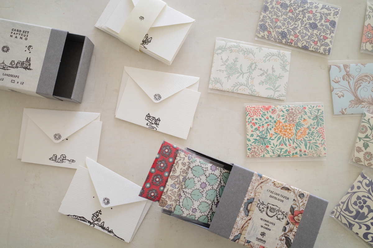 こちらはイタリア紙を使用した小さな封筒とカードのセット。10セット買うとついてくる箱は全て絵柄が異なり、見れば見るほど魅了されてしまいそう。