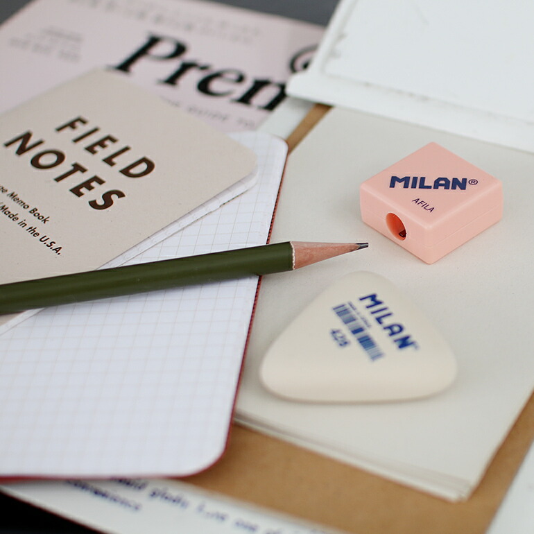 はじめにご紹介するのは、おしゃれなカラーとキャラメルのような形がかわいい「MILAN(ミラン)」の鉛筆削りです。MILANは、1918年創業のスペインの老舗ステーショナリーメーカー。MILANといえば上質感があり使いやすいと人気がある消しゴムが有名ですが、鉛筆削りも展開されています。