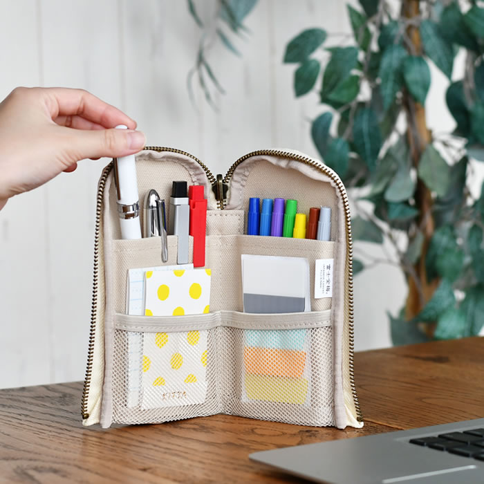 鉛筆やペンはもちろん、15cm定規やハサミなどの大きめの文具もすっぽり入るサイズ感。本体には国産のキャンバス生地である「富士金梅」を採用しているため、適度な強度とふっくらとした柔らかな風合いを両立しています。