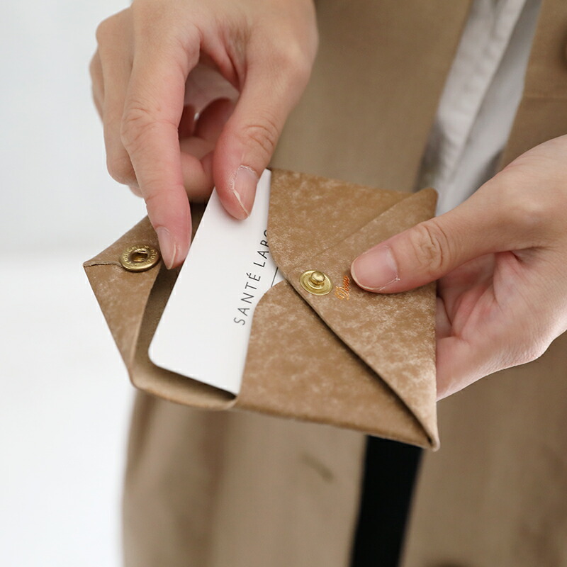 こちらは、革小物を手がけるファクトリーブランド「Dono」の日本製名刺入れ。封筒をモチーフにしたデザインと、どんな服装にも合う上品なカラーが働く女性の心を掴みます。