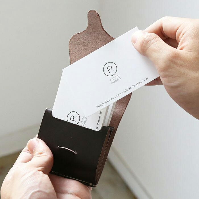こちらは、横長の名刺入れが多い中、縦型で異彩を放っている「ポルコロッソ」の日本製名刺入れ。日本が世界に誇る栃木レザーを使用し、丁寧な手仕事で仕上げた逸品です。差し込みタイプのふたは名刺の出し入れがスムーズで、使いやすさ抜群ですよ。