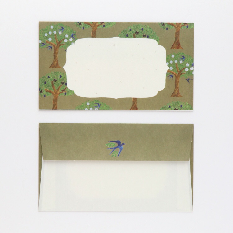 封筒は、森の中にいるような安らぎを感じるデザインです。木々を飛び交うツバメたちの声が聞こえてきそう。家や職場で過ごすことが多い人に「森林浴気分を味わってね」という思いを込めて、手紙を送ってみてもいいですね。