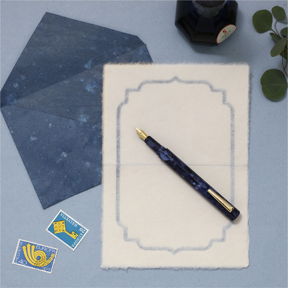 封筒には紙の端材をすき込むことで、複雑な色合いが生まれています。ホワイトとブルーという対照的な2色から、義理の両親に気に入ってもらえそうな色を選んでくださいね。