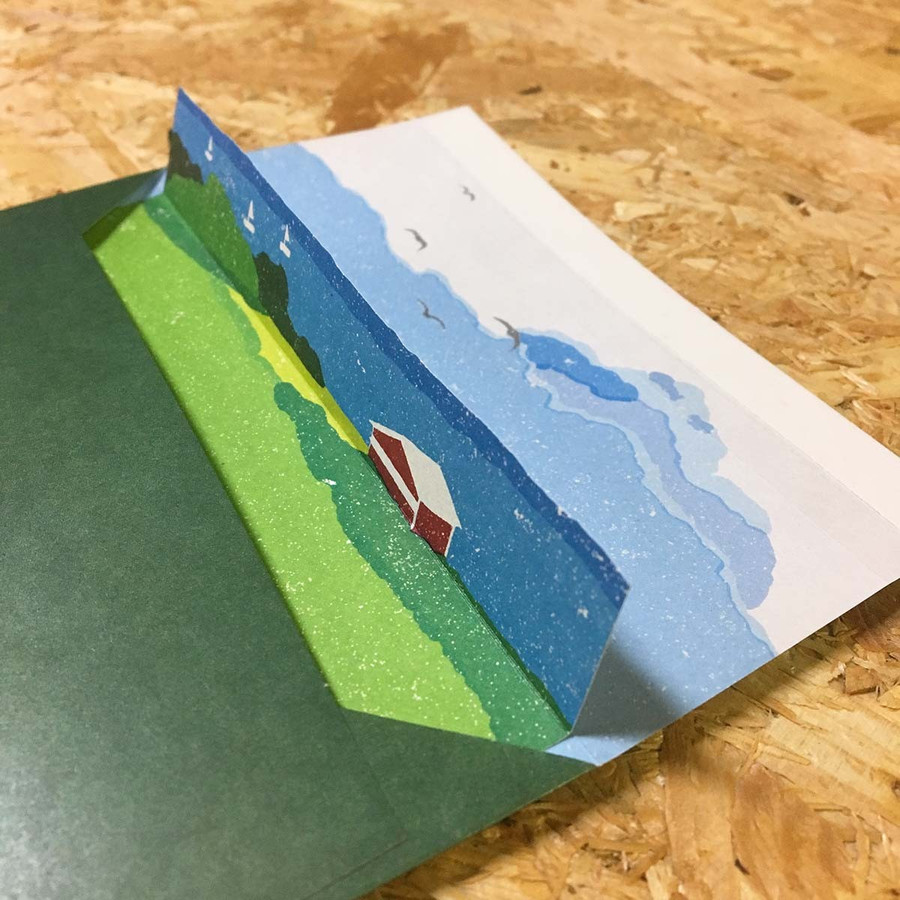 封筒に施されたミシン目加工のおかげで、ペリッと気持ちよく開けられるのもユニークなポイント。便箋の上部を折って入れると、開封したときに立ち上がるよう設計されています。封筒に描かれた空と相まって、立体的な風景が出てくるのはうれしいサプライズになりそう。
