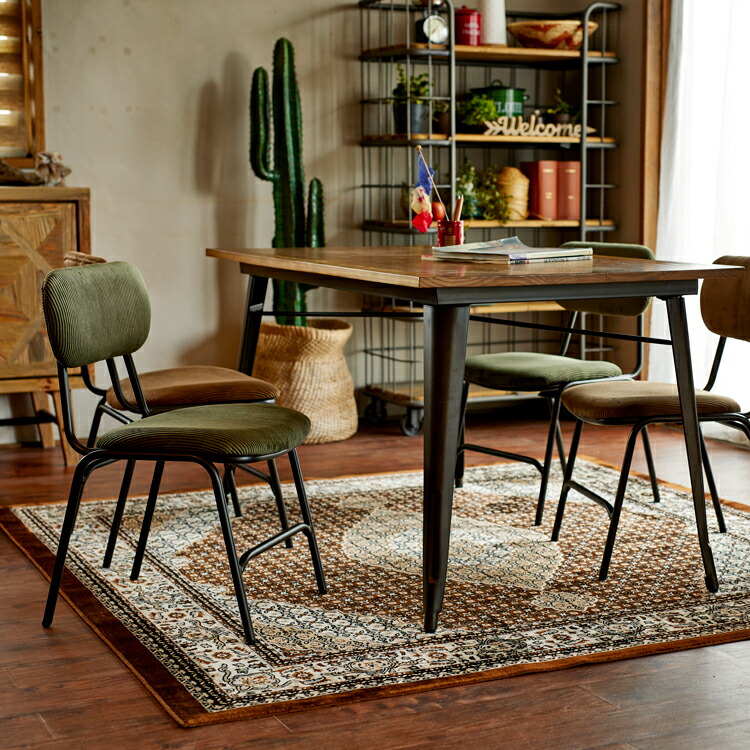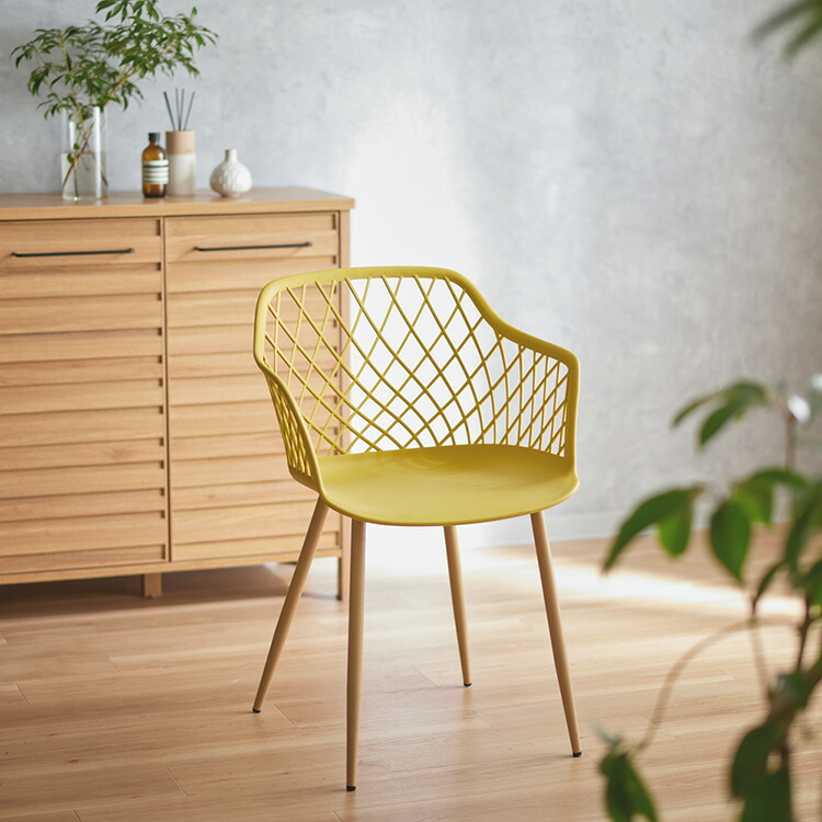 こんな風にダイニングテーブルと合わせても◎。グリーン、ブラウン、イエローの3色展開でどんなインテリアにも馴染みやすく、ワンランクアップしたお部屋が完成します。