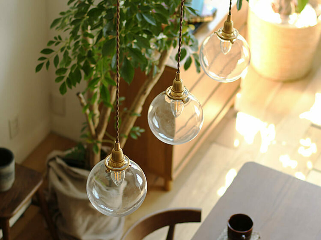 圧迫感を感じさせないクリアシェードは、多灯使いにうってつけ。高さを変えて並べたり集合体にして吊るしたりすると、空間に奥行きをプラスしてくれますよ。