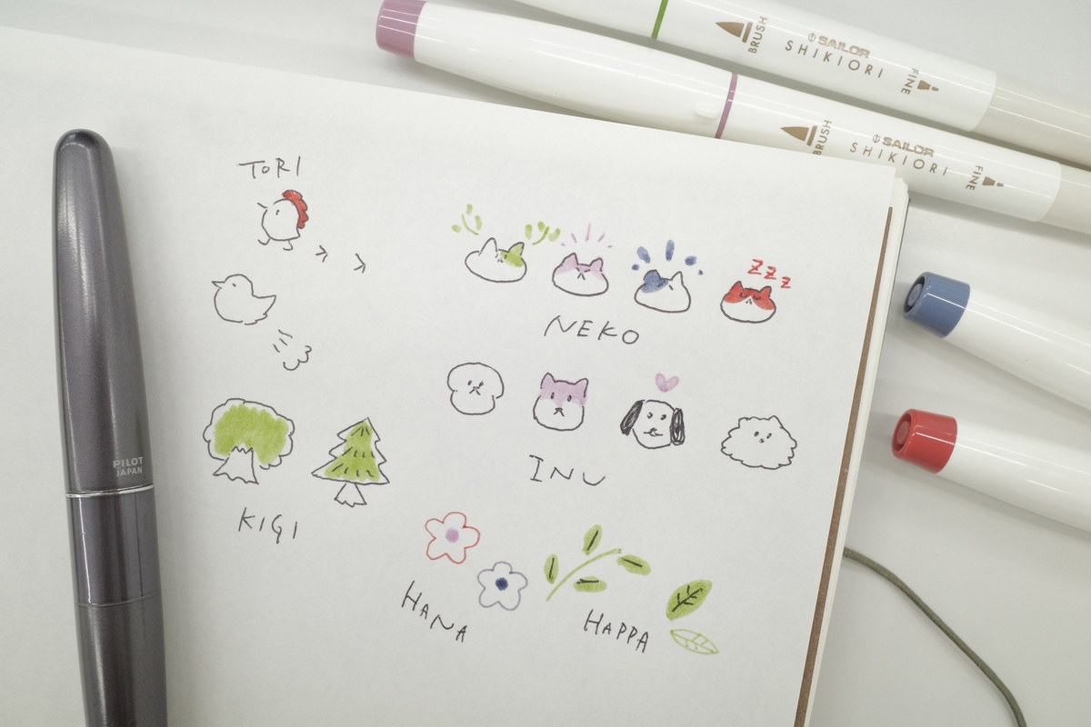 カラーペン1~2本と黒ペンがあれば、誰でも簡単にかわいい動物や植物のイラストが描けちゃいます。全面を塗りつぶすのではなく、一部分のみに色を付けて抜け感を出すことがポイントですよ。