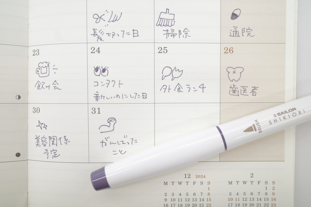 スケジュールやイラストをくっきり目立たせる。「PILOT」の油性ボールペン
