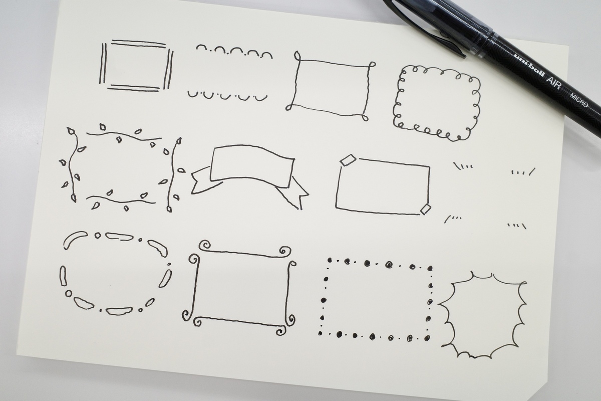 見出しやメモ欄が欲しいときに便利なのが、フレームのイラスト。黒ペンだけで目を引くアレンジがしやすいので、カラーペンが無い場合でも重宝します。くるくるっとラインをつなげたらクッキーのようなかわいいフレームが、植物の蔦を4本組み合わせたらボタニカルなフレームが完成しますよ。
