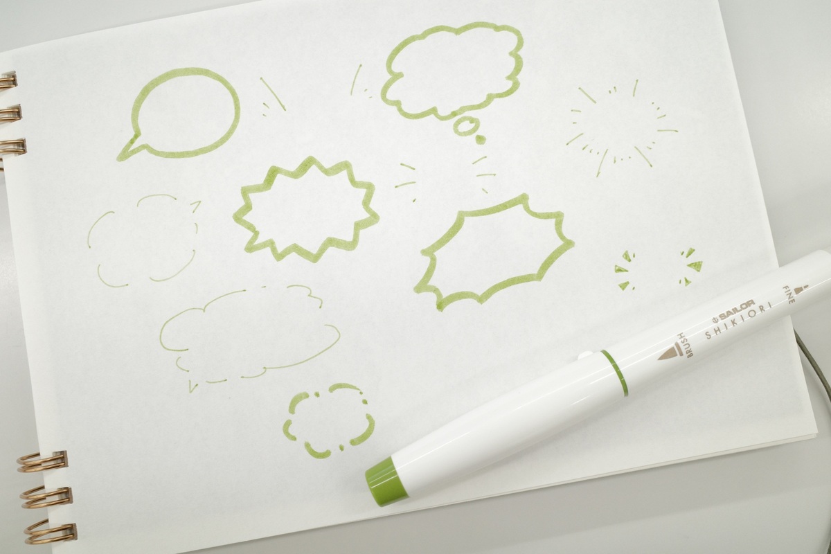 0.7mmのしっかりとした筆跡が特徴の「PILOT」の「コクーンボールペン」。油性インクなので上から色を重ねても滲みにくく、イラストの輪郭を描く際にもぴったりですよ。