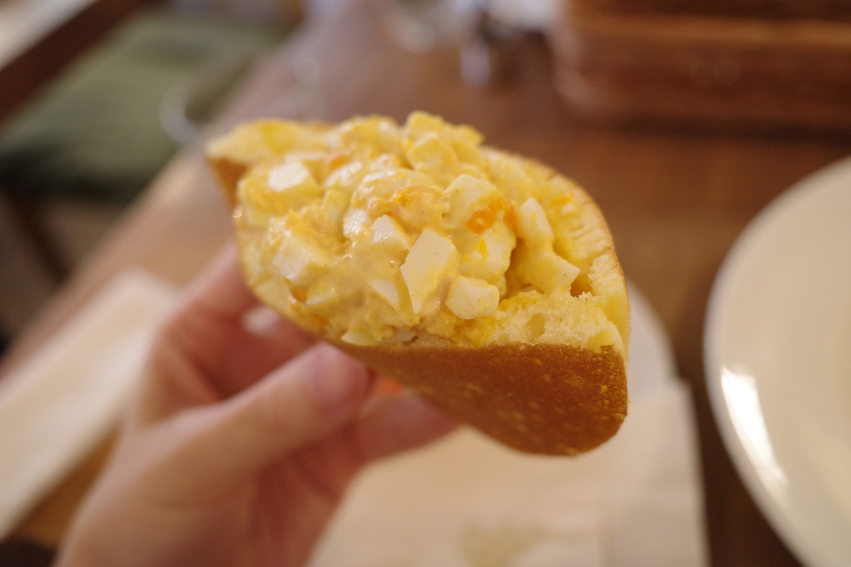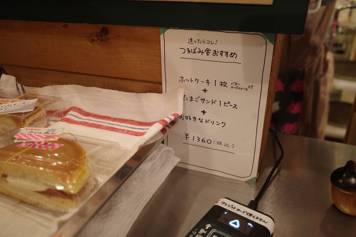 ポップに書かれた「迷ったらコレ!」の文字に吸い寄せられるように、二人揃ってホットケーキ1枚+たまごサンド1ピース+ドリンクのセットを注文。たっぷりのバター・メープルシロップがかかった焼きたてのホットケーキと、ホットケーキの中にたまごサラダが詰まっているちょっと不思議なたまごサンドは、どちらもここでしか食べられない「つるばみ舎」定番のメニューです。